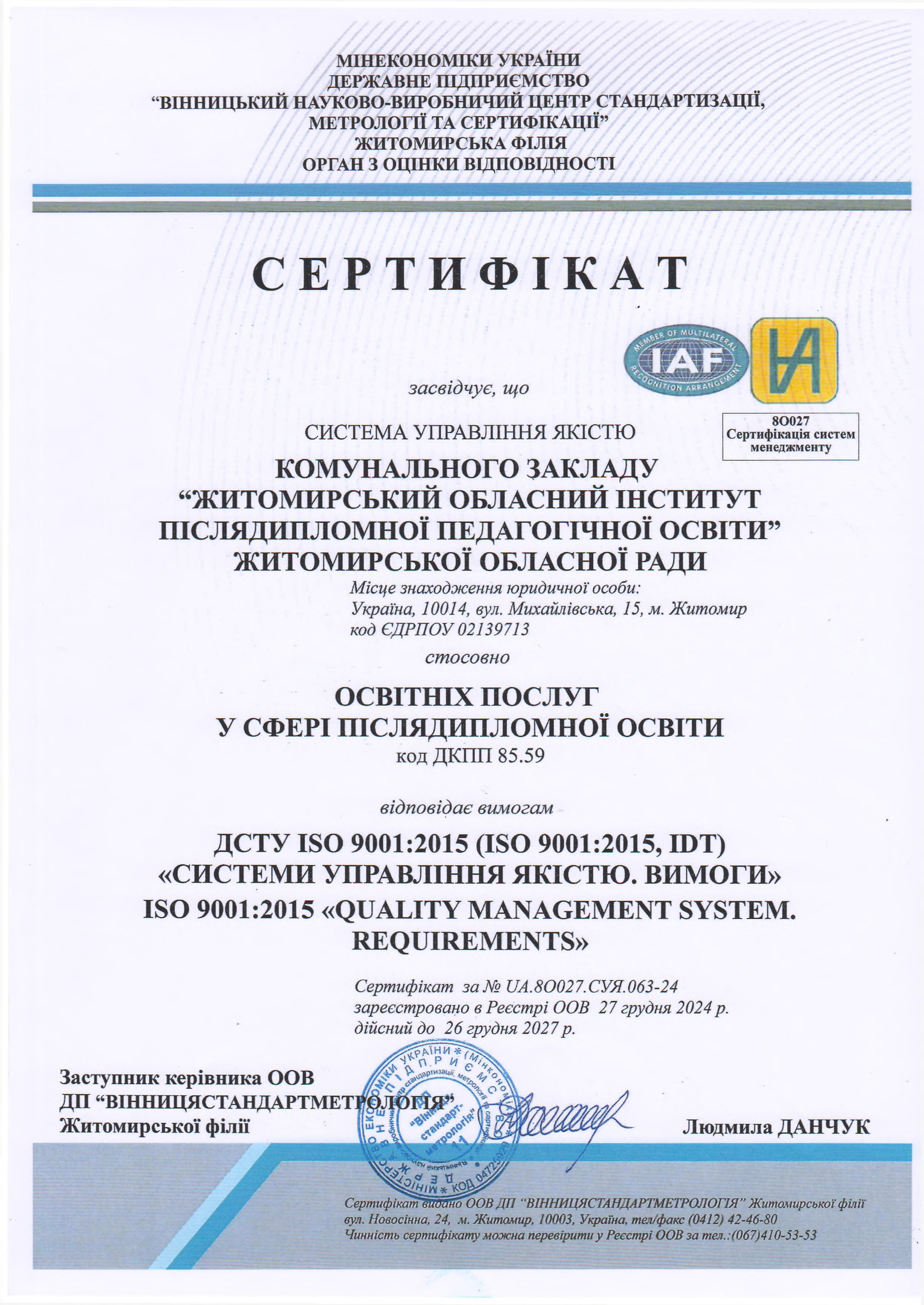 Житомирський ОІППО – простір професійного зростання та розвитку компетентностей сучасного педагога. Система управління якістю у закладі гарантує високий стандарт освітніх послуг (сертифікат №UA.8О027.СУЯ.063-24, дійсний до 26.12.27р).