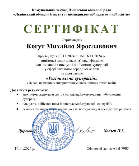Здійснення комплексу заходів із професійної підтримки та допомоги педагогічним працівникам закладів загальної середньої освіти (здійснення супервізії) згідно з вимогами професійних і освітніх стандартів