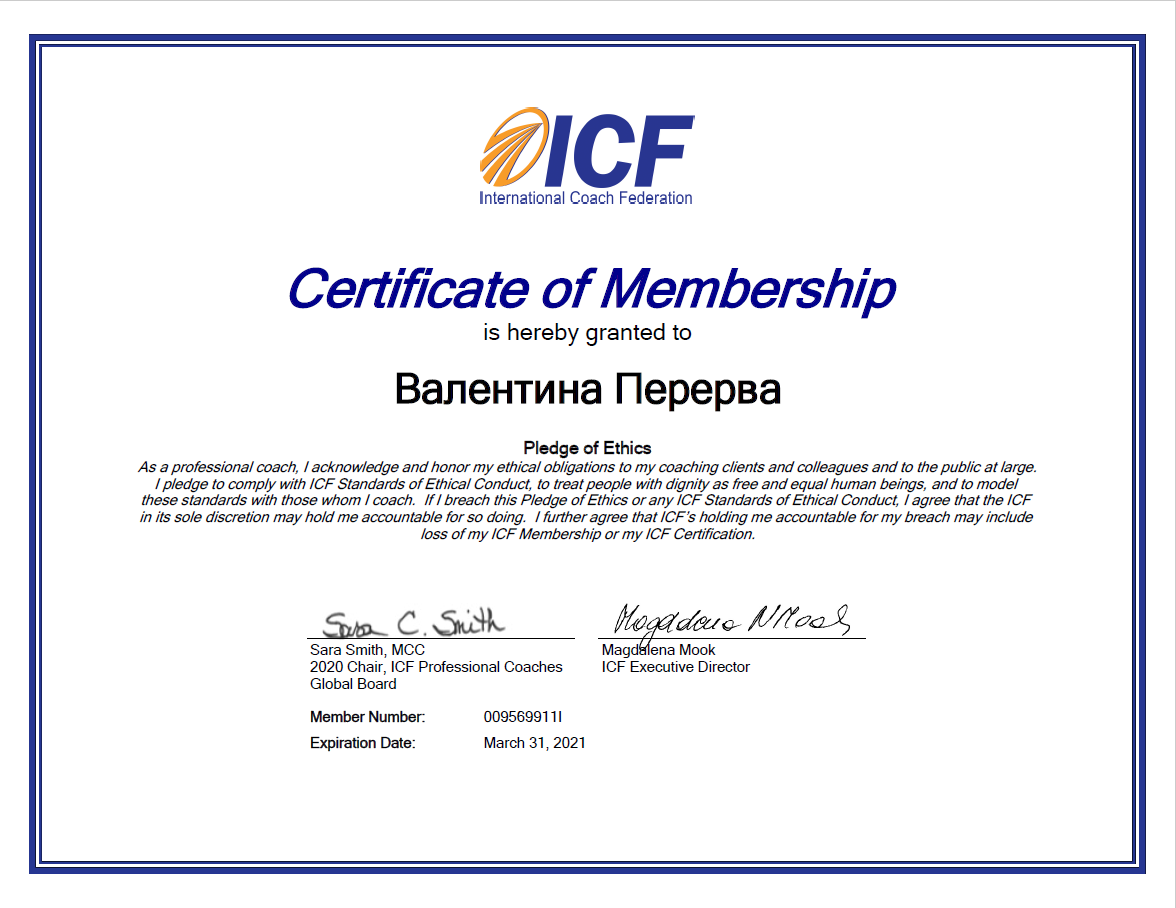 Маю фахову експертність як коучка рівня АСС, із досвідом роботи в індивідуальному та командному коучингу більше 400 годин, акредитована Міжнародною коучинговою федерацією (ICF).