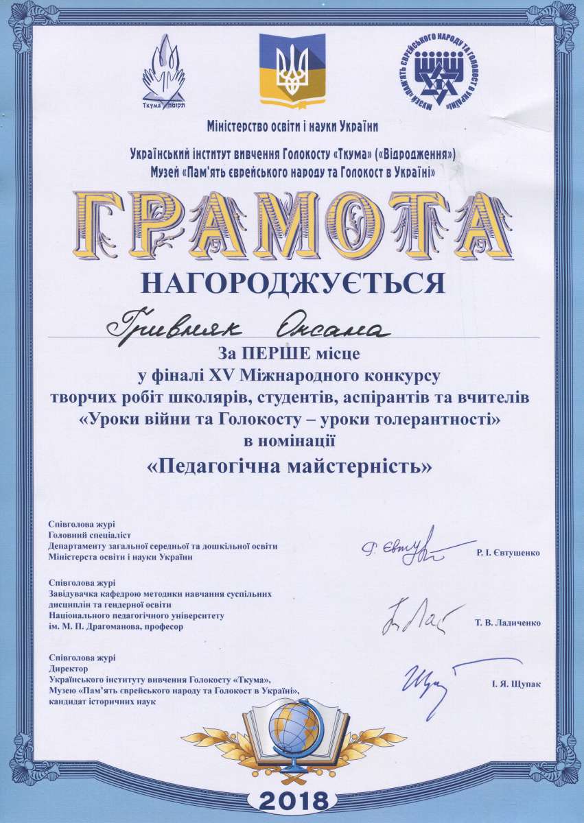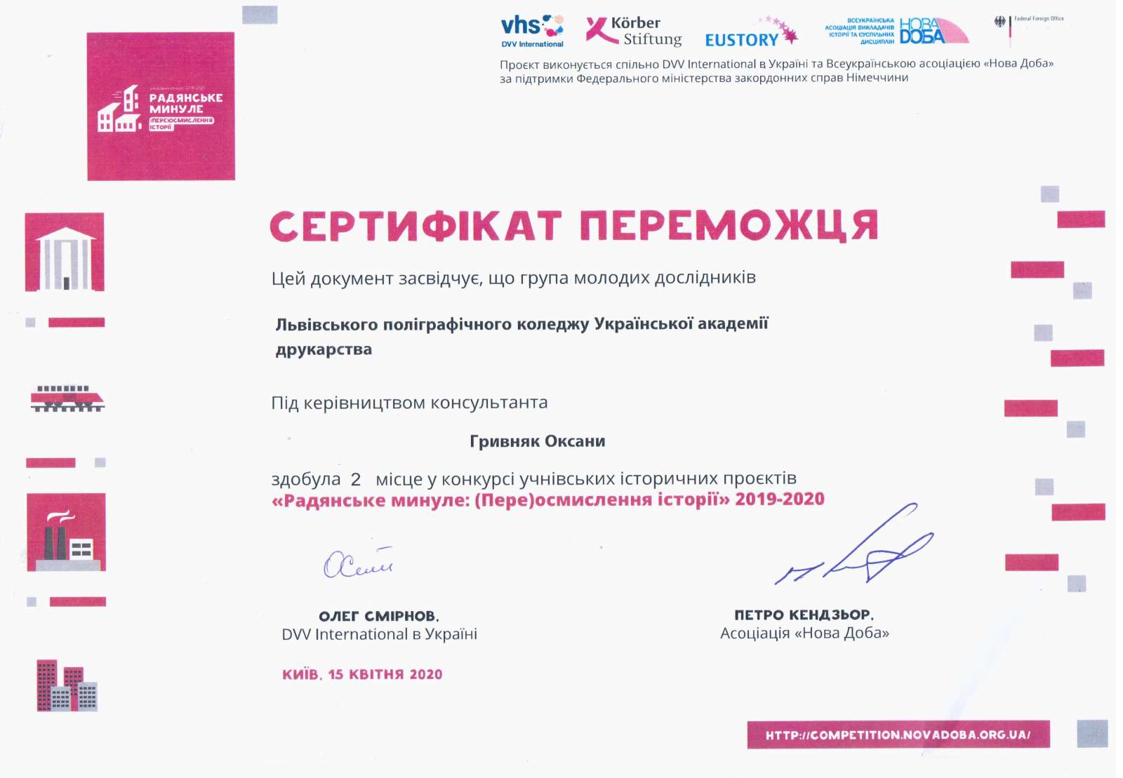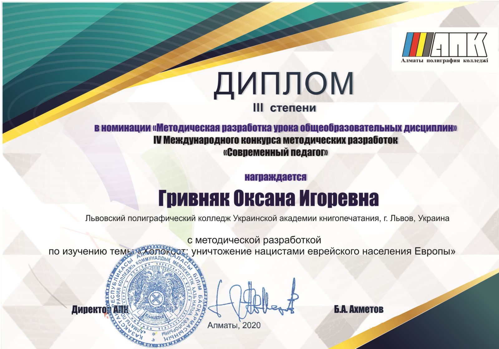 Я, Гривняк Оксана, працюю викладачем суспільних дисциплін ВСП "Львівський поліграфічний коледж Української академії друкарства" з 2000 року. Маю звання викладача-методиста та переможців всеукраїнських і міжнародних конкурсів.