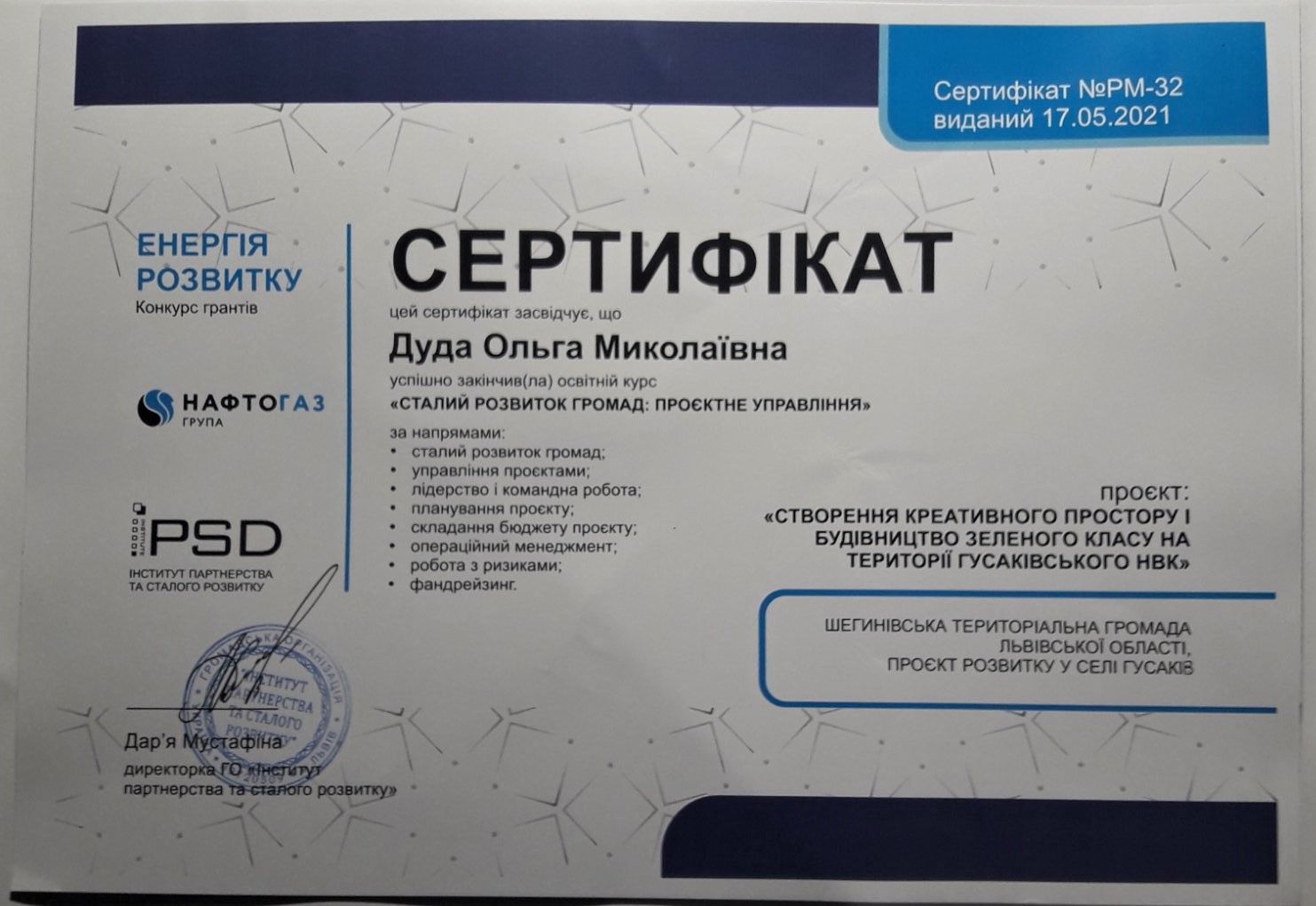 Заступник директора Гусаківського НВК, вчитель географії та економіки, секретар Агенції місцевого розвитку с. Гусаків. Маю досвід написання багатьох проєктів, 11 з яких були успішно реалізовані.