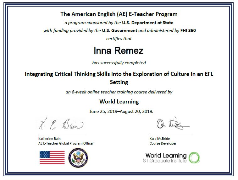 -у 2019-2020 році успішно закінчила навчання за програмою відділу освітніх програм Посольства США в Україні, та реалізувала навчальний проект на місцевому рівні,( онлайн курс для вчителів з критичного мислення),