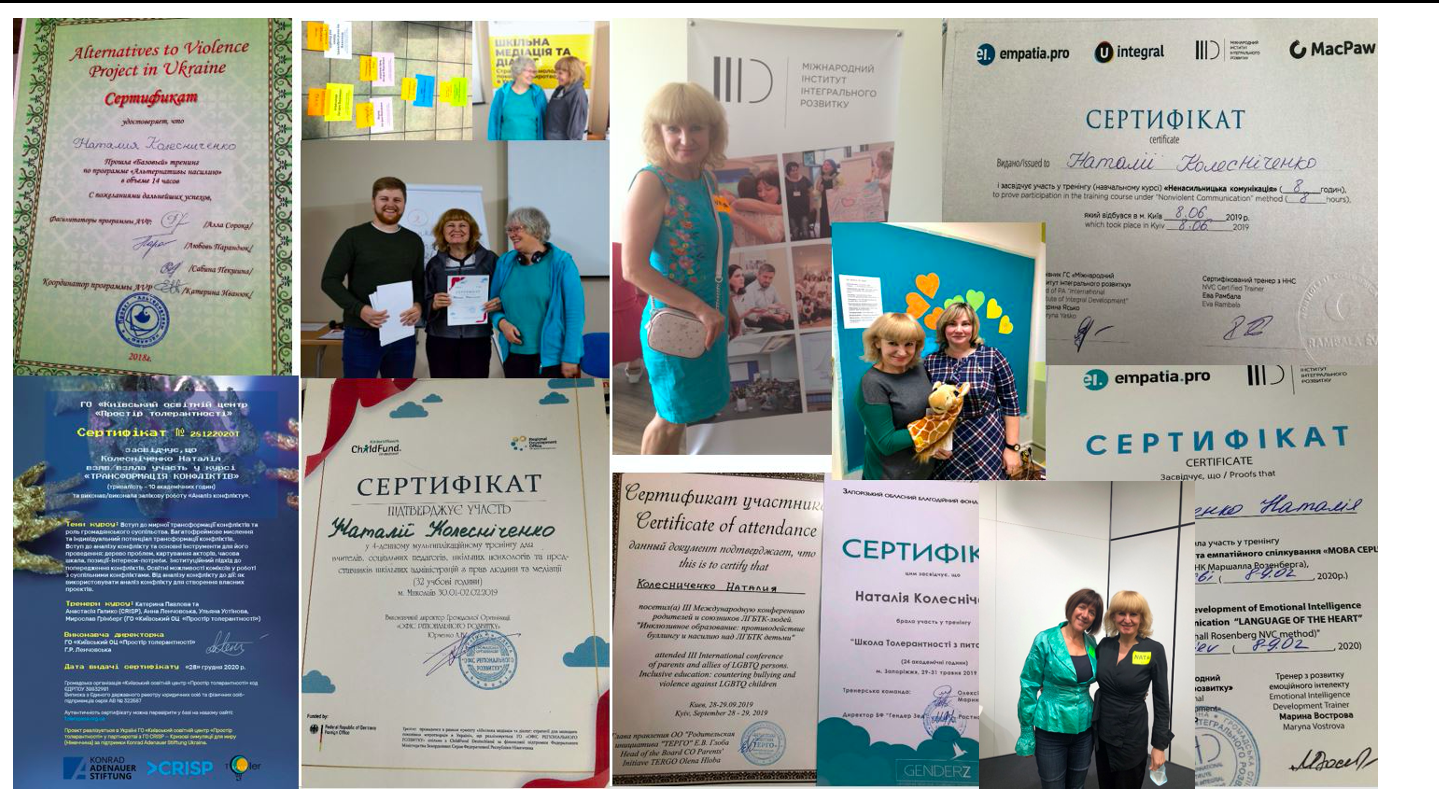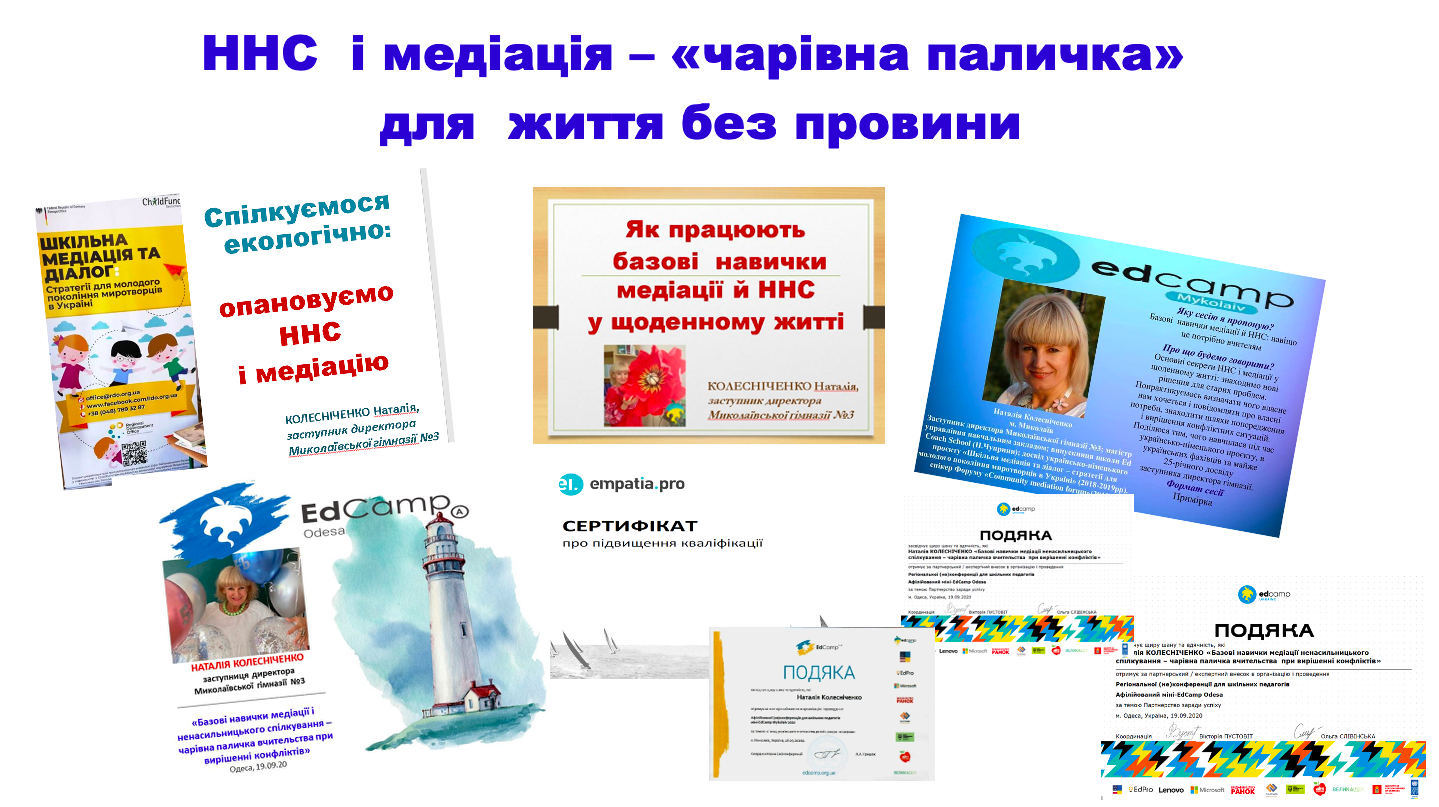 досвід українсько-німецького проєкту «Шкільна медіація та діалог – стратегії для молодого покоління миротворців в Україні» (2018-2019), міжнародного проєкту «Територія без провини. Практикум для освітян»(2021);