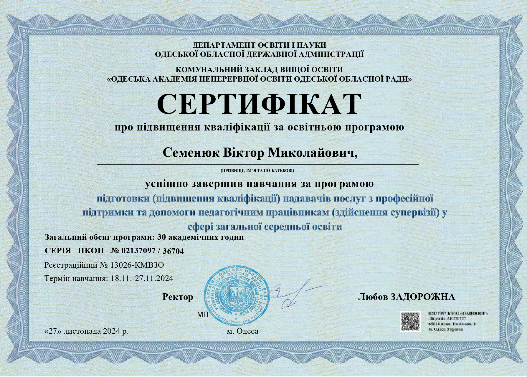 Заступник директора з навчально-виховної роботи Одеського ліцею № 43 Одеської міської ради, тренер Академії цифрового розвитку, Google for Education Certified Trainer, супервізор у сфері загальної середньої освіти