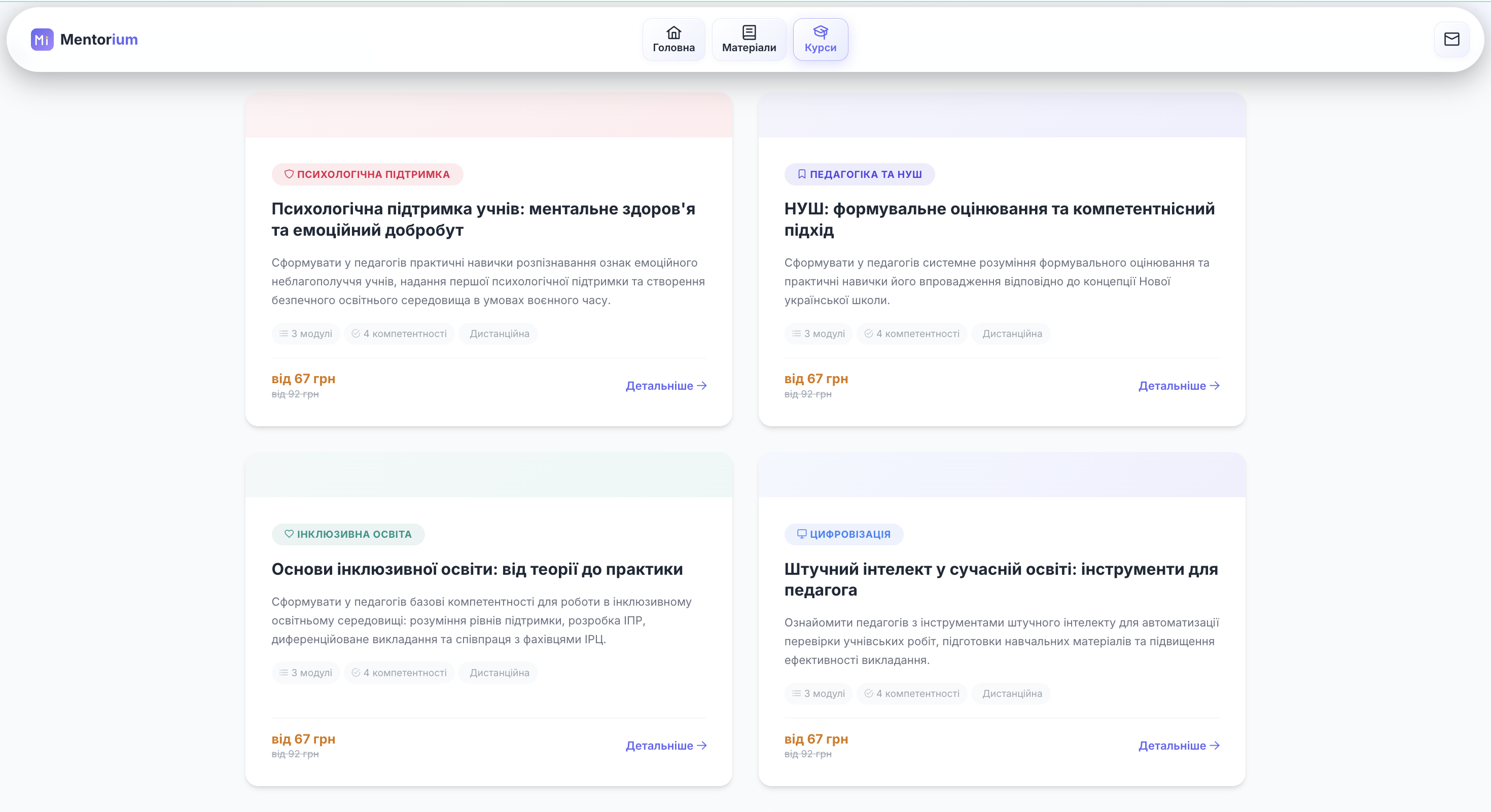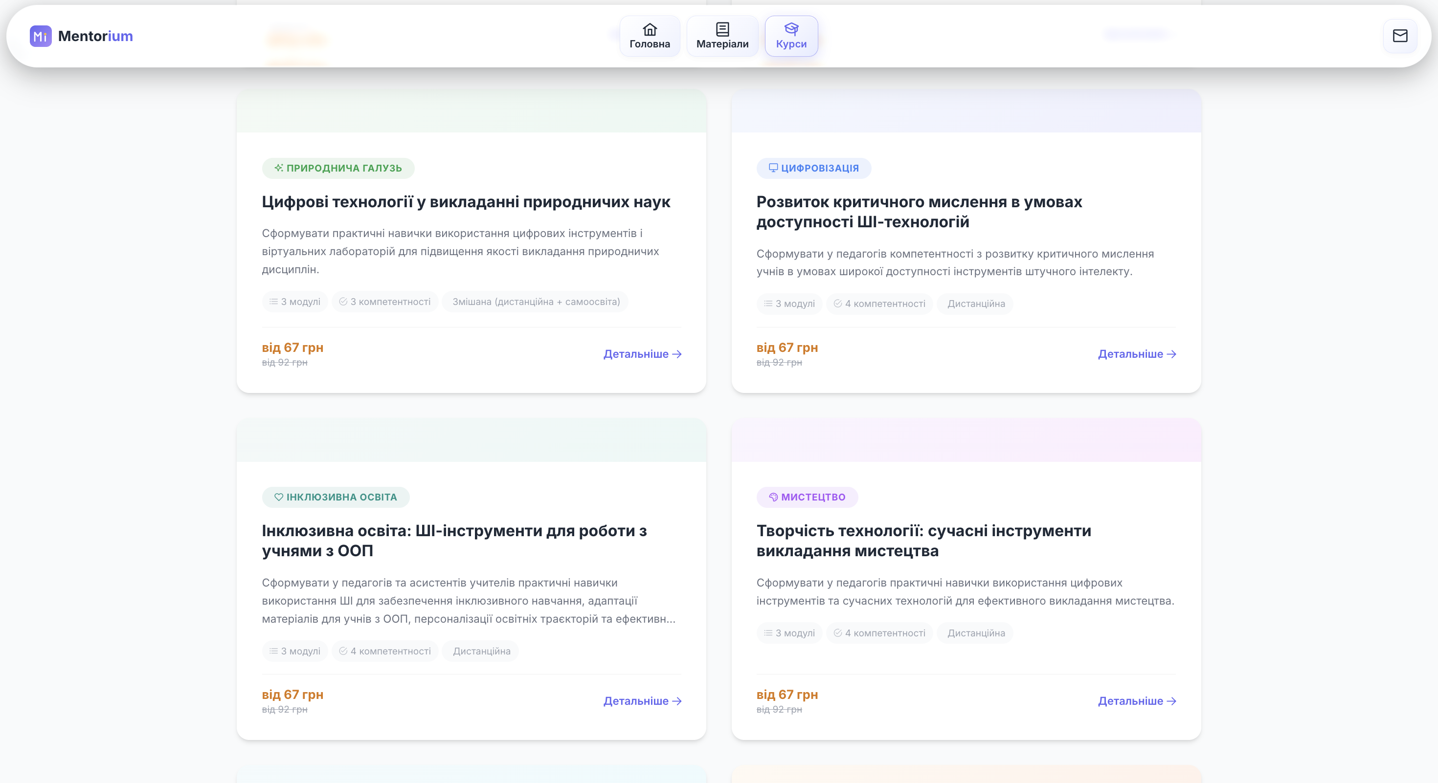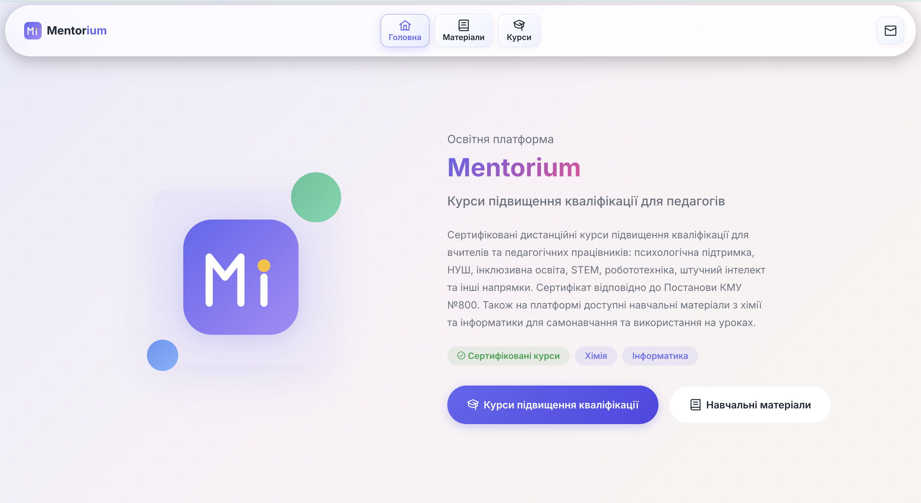 Mentorium — освітня онлайн-платформа для вивчення хімії та інформатики з різними рівнями складності (від базового до поглибленого), а також для підвищення кваліфікації педагогічних працівників у сфері цифровізації навчальних дисциплін та розвитку цифрової грамотності.