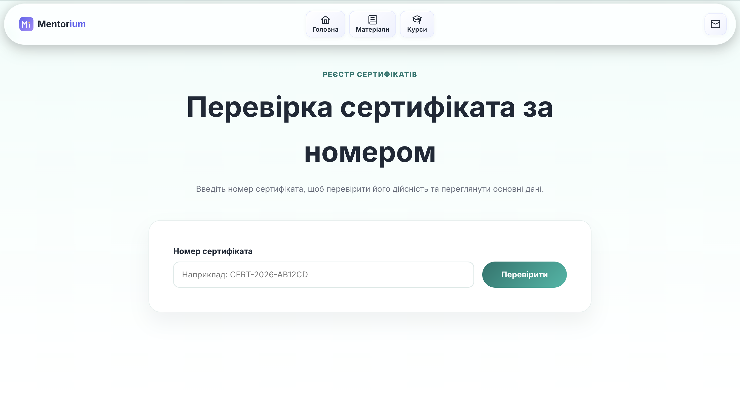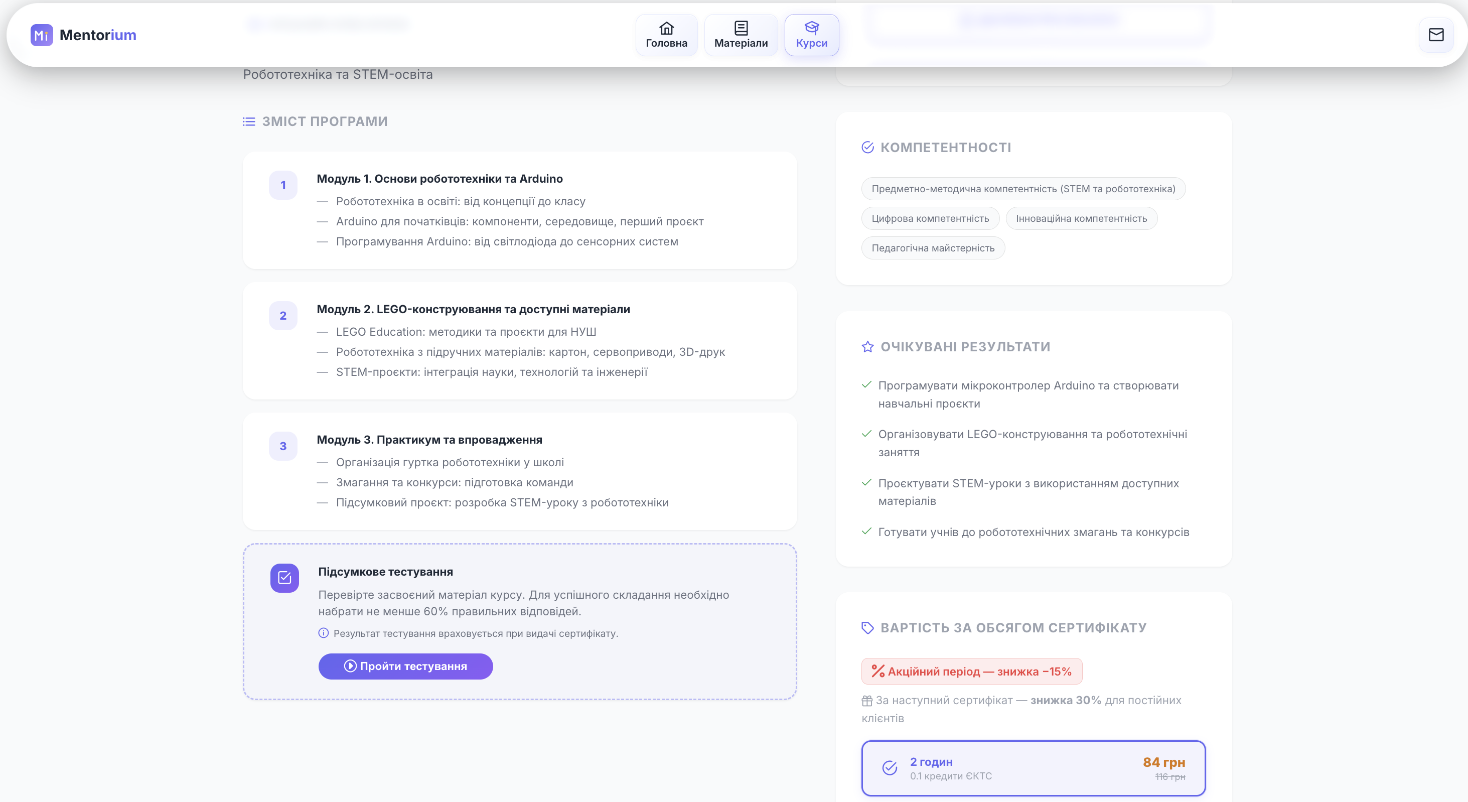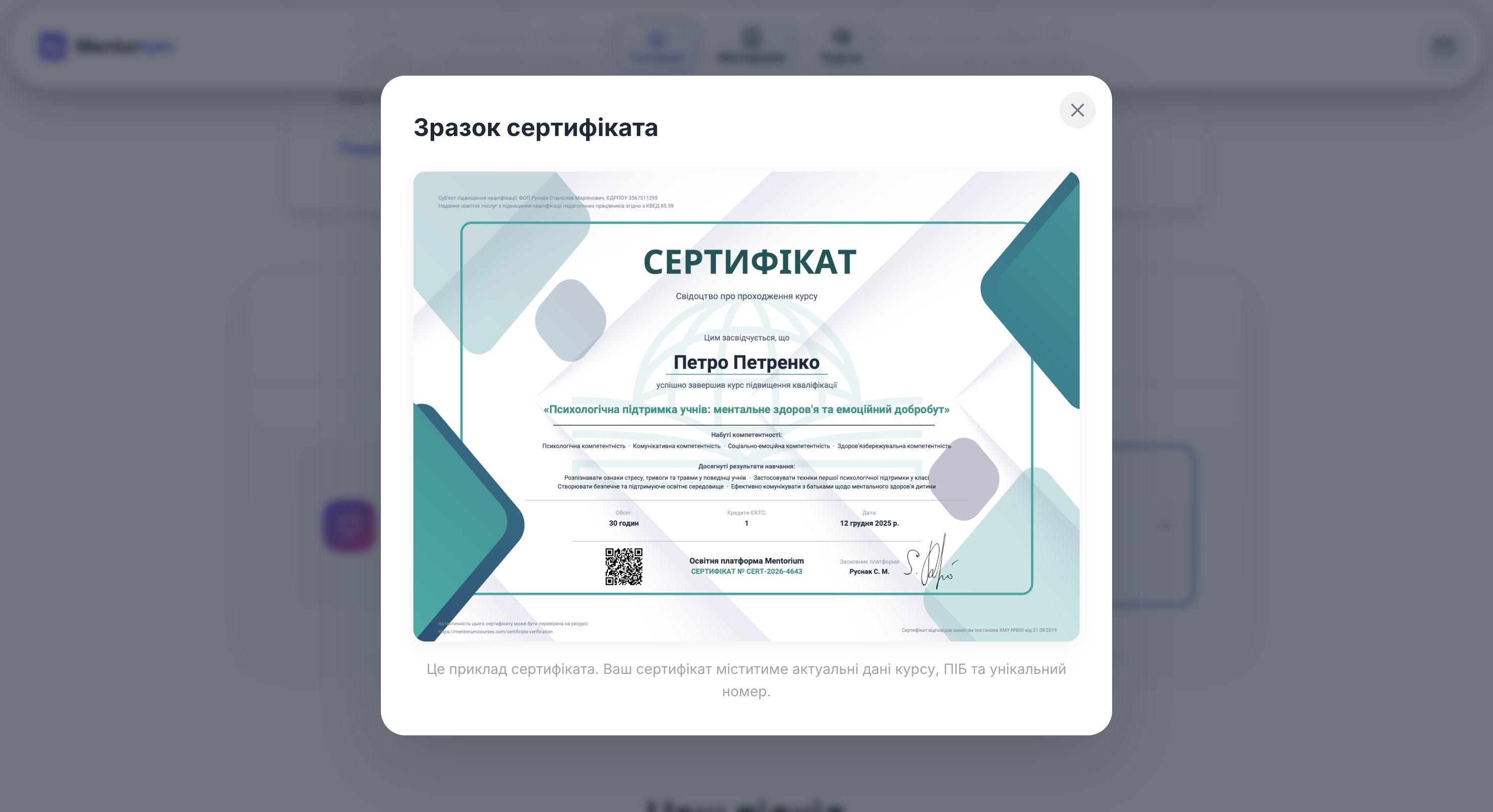 Платформа надає доступ до навчальних матеріалів у доступній і прикладній формі, пропонує сертифіковані курси підвищення кваліфікації відповідно до Постанови КМУ №800 від 21.08.2019 «Про затвердження положення про систему підвищення кваліфікації педагогічних працівників» та забезпечує видачу сертифікатів з автоматичною реєстрацією у електронному реєстрі з можливістю онлайн-перевірки.